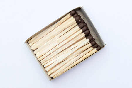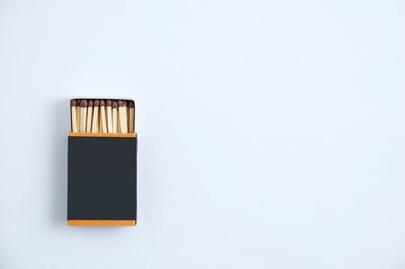 matches in a box on a white wooden background.