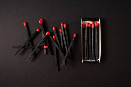 Black wood matches with red heads on dark black paper background. Creative flat lay, top view. Minimalistic artistic style.