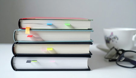 Classic novels with colorful tabs and bookmarks, reading glasses and tea cup beside them.