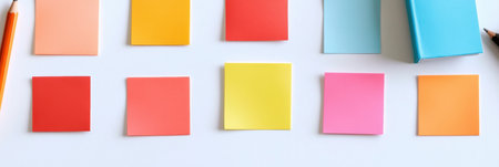 Colorful sticky notes and paper tabs are orderly arranged on a white desk, designed to inspire organization and enhance productivity during work tasks.