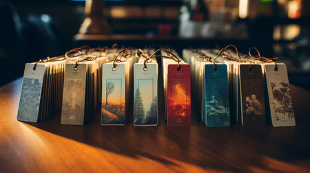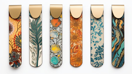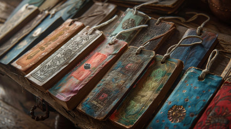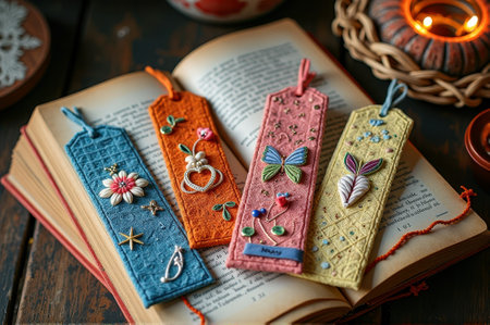 Colorful handmade bookmarks on open book with intricate designs. That the image is generated using AI.