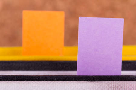 Close-up of a stack of office notepads with colorful sticky page markers sandwiched between pages on purple background