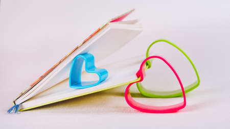 Partial blur Two red hearts on the pages of a book, retro effect of contrasting enhanced colors, love in valentine's day concept