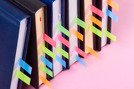 Close-up of a stack of office notepads with colorful sticky page markers sandwiched between pages on pink background