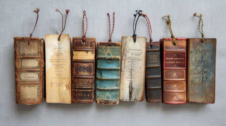 Stack of vintage hardcovered books with bookmarks on a bookshelf. Bookshop background texture