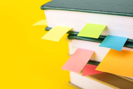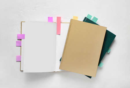 Books with colored sticky notes for marking pages. Literature in the library. Light background.