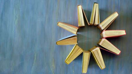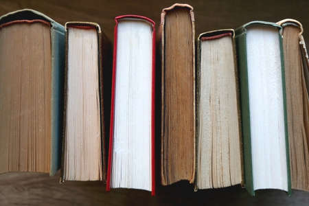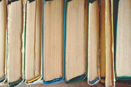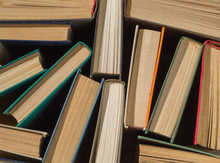 Background From Old Books. Top view of chaotically standing old and used books or hardcover textbooks. Book background template for (wisdom, science and education). The concept of reading and writing