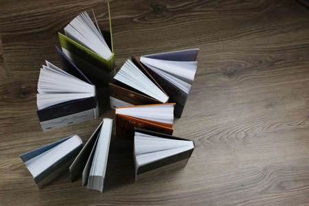 Multicolored books, top view. A lot of books are close-up.