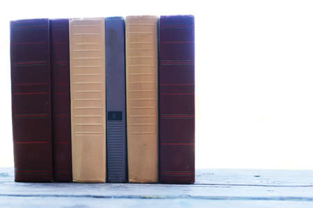 old books standing on wooden table in vintage tone