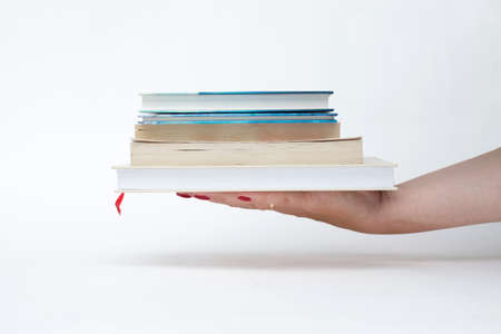 female hand with red manicure holding a stack of books white background
