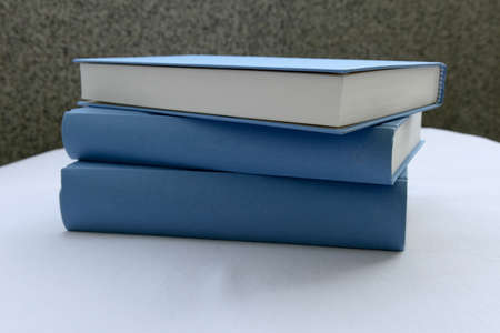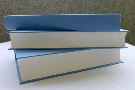 Pile of blue books stacked on a white surface, isolated