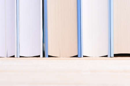 Book spines lined up on the shelf, close-up, learning and education concept.