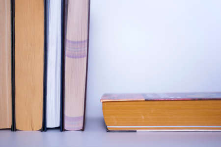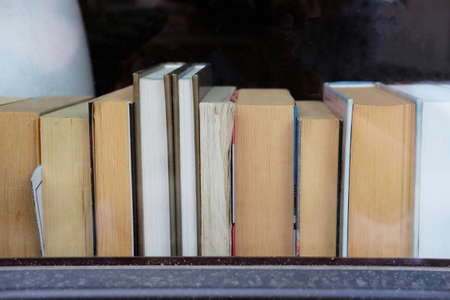 A stack of used books of different thicknesses on the shelf in the library, selective focus