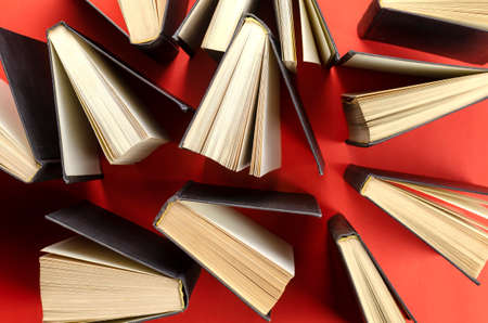 Composition with vintage old hardback books on red background. Books open. Back to school. Education background.