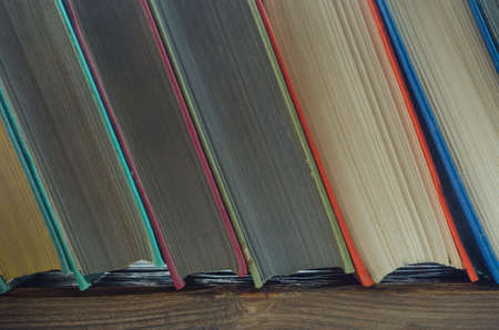Books next to each other top view. Background from multicolored old books.