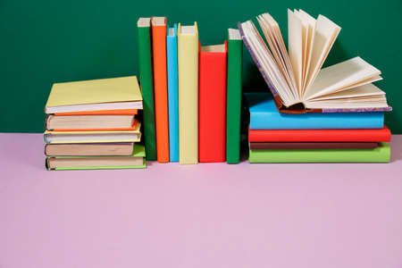 Back to school. A stack of books on a colored background. Copy space