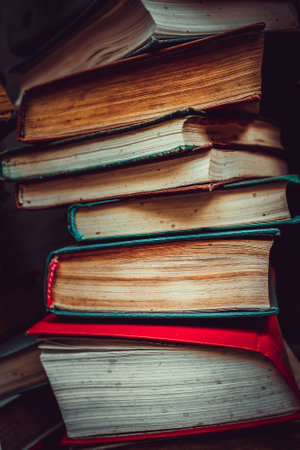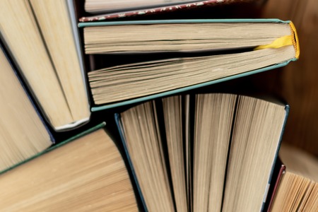 Closeup abstract background of stacked on each other old books