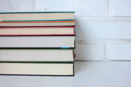 Stack of books on the table against white brick wall. Back to school background. Copy space