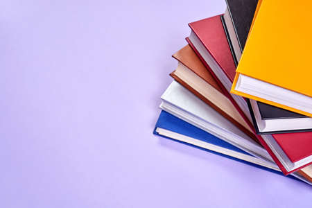 Stack of colorful books on purple background
