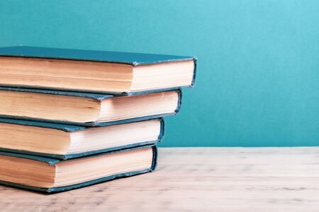 Composition with vintage old hardback books, diary, fanned pages on wooden deck table and colored background. Books stacking. Back to school. Copy Space. Education background.
