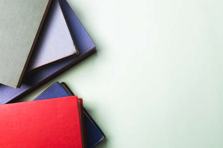 Top view of colorful hardback old books with copy space. Education background.
