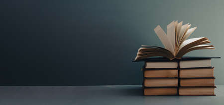Open book on a stack of books on a table on a dark background. Education and reading of paper books. Exam preparation in schools and colleges