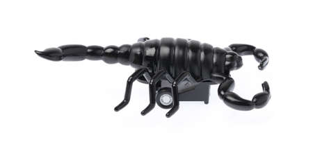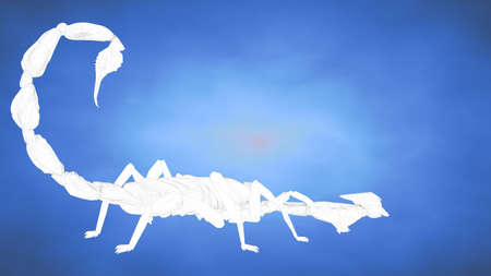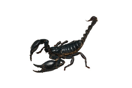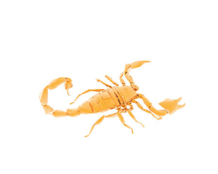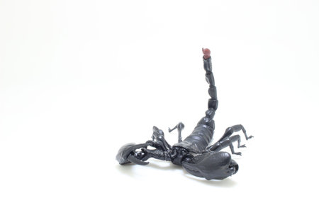 A scorpion on white background shows its powerful stinger threatening to inject its venom. Outdoors.