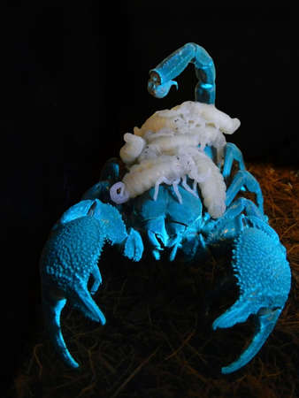 Emperor scorpion, its scientific name is Pandinus imperator under UV lamp