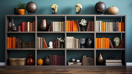 A stylish bookshelf featuring an assortment of colorful books and decorative plants against a turquoise wall, perfect for enhancing any living space.