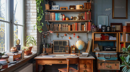 Cozy Vintage Home Office with Bookshelves, Nostalgic Decor, and Natural Light