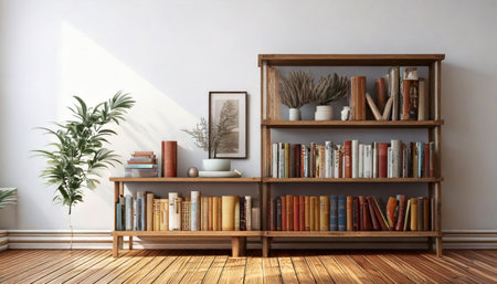 Blur background of book shelf in library space filled with books and green plants, enhancing a serene reading environment. Personal study and relaxation concept. Interior design concept. Spate.
