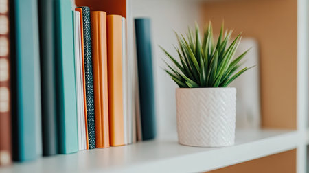 A thoughtfully arranged shelf showcasing an array of colorful books alongside a vibrant potted plant, enhancing the modern, minimalist interior decor.