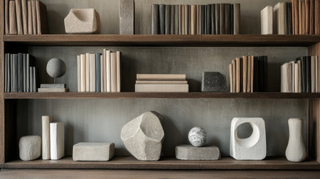 A captivating arrangement of geometric shapes and textured objects displayed on wooden shelves, creating a serene and minimalist aesthetic for modern interiors.