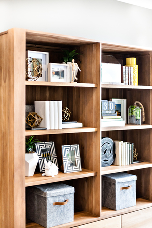 A minimalist bookshelf with an assortment of books and decorative items, placed against a neutral wall.