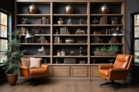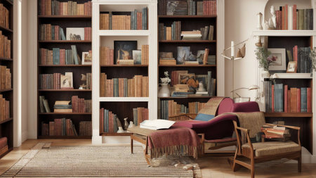 Wooden library bookshelf, shelves packed with books, elegant furniture, cozy interior glow.