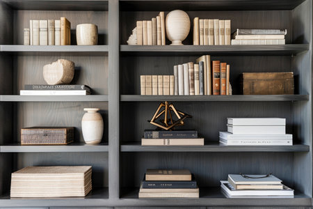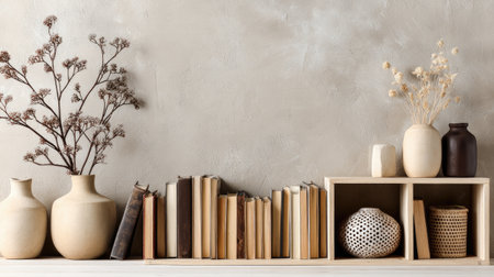 A beautifully arranged shelf featuring neutral vases, dried floral arrangements, and a collection of vintage books, perfect for inspiring modern and elegant home decor themes.