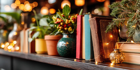 A cozy reading nook featuring a collection of books, elegant plants, and soft lights, creating a warm and inviting atmosphere perfect for relaxation.