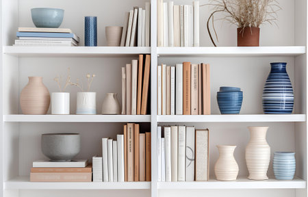 Bookcase with books in a modern white house. Generative AI. High quality illustration