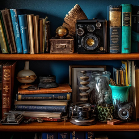 Old wooden shelf with fancy and antique items like old boxes and books next to picture frames and wooden bevels beside vases and 3d items like statues