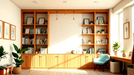 Light wooden bookshelves holding many books and plants illuminating a modern living room