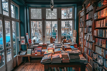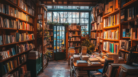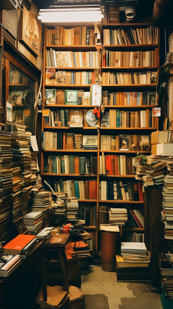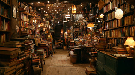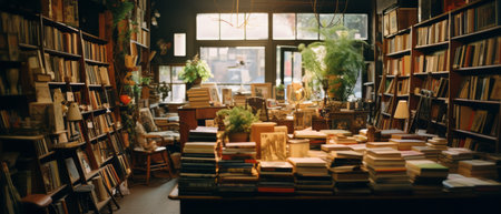 Cozy bookstore interior filled with stacks of diverse books and charming decor creating a warm inviting atmosphere