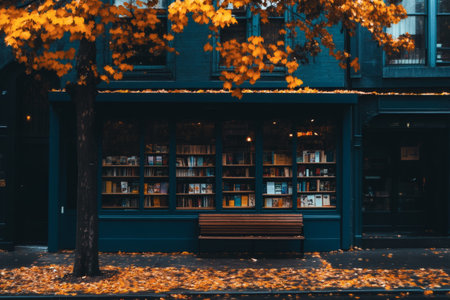 Golden leaves blanket the sidewalk near a quaint bookstore. Its windows showcase colorful book spines, inviting passersby to explore the literary treasures within. The air is fresh and cool.