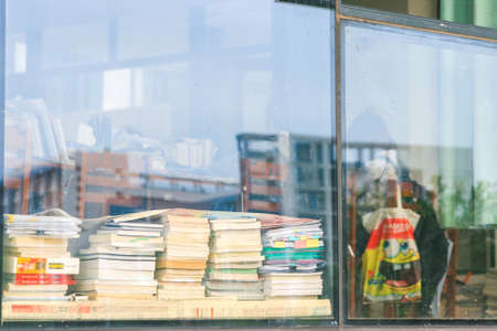 Japanese book such as novel cartoon text second hand pile stack sale in old used book store in Kyoto, JAPAN.,2 December 2017.
