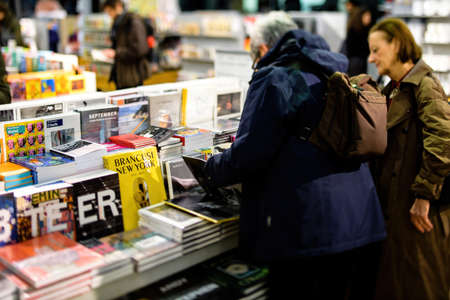 Unidentified people visit book shop in Oxford street. Oxford Street is a major shopping street in London.