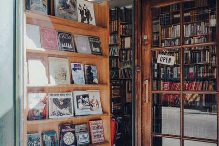 London, UK - March 06, 2020: Shop front and open sign on the entrance of Any Amount of Books bookshop in Covent Garden, a famous tourist area in London with lots of shops and restaurants.