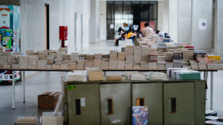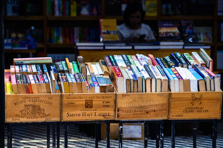 Jakarta, Indonesia - October 2022: stacks of books neatly arranged at an exhibition in the Jakarta library.