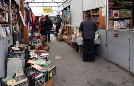 Book market Petrivka located in Kyiv, Ukraine. Famous for its great range of books. Sprawling open air market with stalls selling secondhand books. Despite the war and the fact that there are no tourists, this place remains very popular for locals who vis
