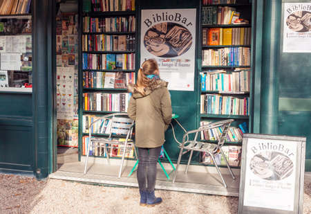 Venice Italy. March 2019: Aqua alta bookstore of second hand books, situated at the canal entrance