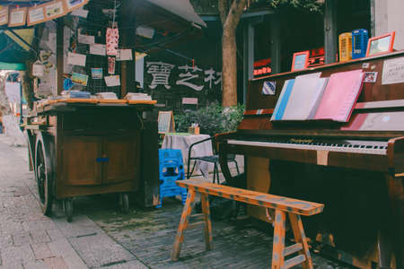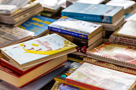 Chengdu, China - July 2019 : Pile of second hand books for sale on a street market