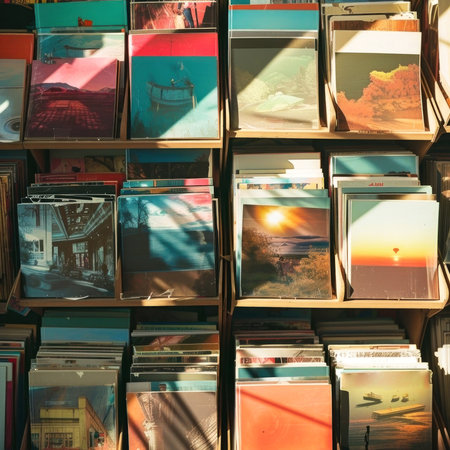 Vintage postcard collection bathed in sunlight evokes nostalgia and adventure. Discover scenic landscapes and timeless memories. Perfect for art enthusiasts. Generated A.I.